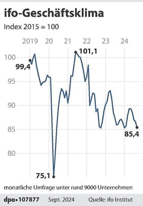 München – Die Stimmung der Unternehmen in Deutschland hat sich laut Münchner Ifo-Institut auch im September weiter verschlechtert. Der Ifo-Geschäftsklimaindex sank auf 85,4 Punkte, nach 86,6 Punkten im August, wie das Institut mitteilte. Die Unternehmen w