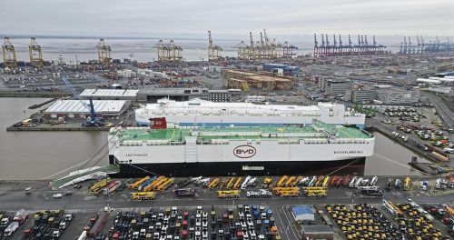 BYD-Frachter in Bremerhaven: Der chinesische Hersteller bringt tausende Autos mit eigenen Schiffen in die EU. Die EU sagt, China flute den europäischen Markt mit Dumping-Autos. © Lars Penning/dpa