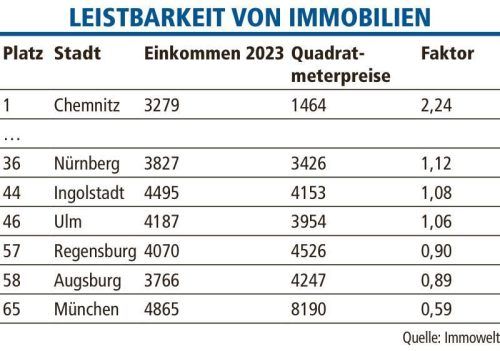 Nürnberg – Wer mit seinem Einkommen eine Immobilie kaufen möchte, hat in München damit deutschlandweit die geringste Chance. Das geht aus einer Auswertung des Immobilienportals Immowelt hervor. Das Portal hat dafür Durchschnittsgehälter in den 65 größten deutschen Städten mit den mittleren Quadratme