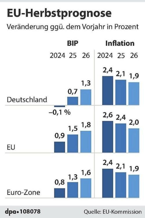 Brüssel – Auch die EU-Kommission hat ihre Wachstumsprognose für Deutschland in diesem Jahr weiter abgesenkt – sie erwartet im kommenden Jahr aber ein Plus von immerhin 0,7 Prozent hierzulande. Für die Eurozone rechnet die Kommission im kommenden Jahr mit einem deutlich stärkeren Wirtschaftswachstum