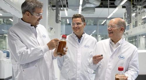 Hoher Besuch in weißen Kitteln: Bayerns Ministerpräsident Markus Söder (links), Roche-Chef Thomas Schinecker (Bildmitte) und Bundeskanzler Olaf Scholz (rechts). © Sven Hoppe, dpa
