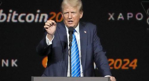 Der künftige US-Präsident Donald Trump sprach im US-Wahlkampf auf einer großen Bitcoin-Konferenz. Er will die Kryptobranche fördern – und hat auch selbst ein kommerzielles Krypto-Projekt. © Mark Humphrey/dpa