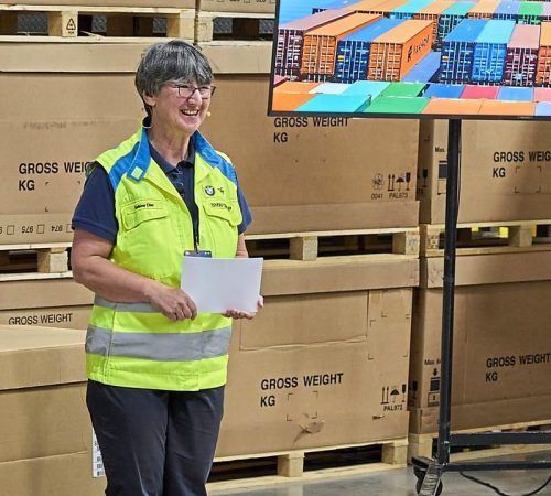 Verpackungs-Expertin Sabine Eller in einer Logistikhalle. Rechts oben: Mit speziellen Paletten werden die Seecontainer bis an die Decke gefüllt. Rechts unten: Bei der Weihnachtspost rät Eller zu Recyclingverpackungen. © Fotos: Daniel Kraus, Panthermedia