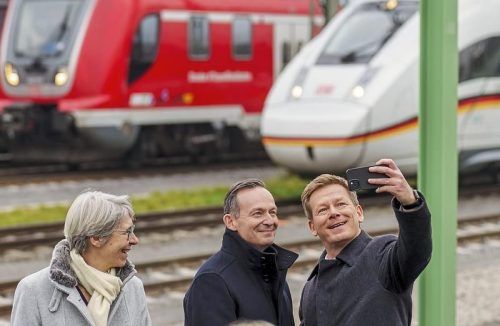 Selfie der Planer: Bundesverkehrsminister Volker Wissing (Mitte) und Bahn-Chef Richard Lutz am Samstag im hessischen Gernsheim. Links im Bild: Elke Zimmer, Staatssekretärin im Verkehrsministerium von Baden-Württemberg. © Andreas Arnold, dpa