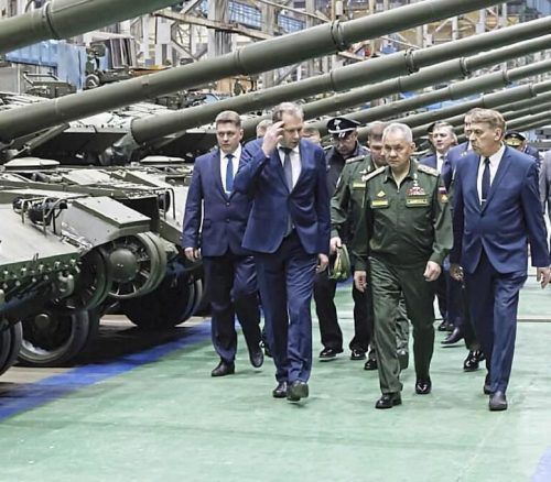 Die Kriegswirtschaft (im Bild ein Besuch des damaligen russischen Verteidigungsministers Sergej Schoigu, 2.v.r) überdeckt zeitweise andere ökonomische Probleme. © dpa