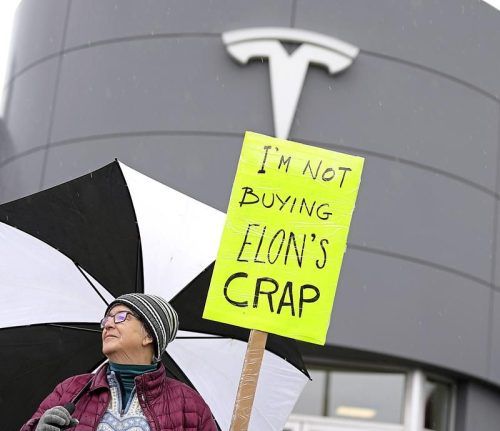 Protest gegen Tesla in Kanada und in vielen anderen Ländern. Das schlägt sich bereits in den Verkaufszahlen nieder. © Justin Tang, dpa