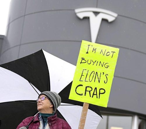 Protest gegen Tesla in Kanada und in vielen anderen Ländern. Das schlägt sich bereits in den Verkaufszahlen nieder. © Justin Tang, dpa