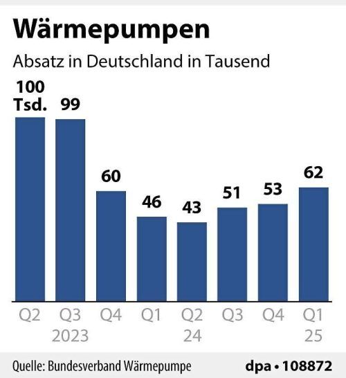 Berlin – Die Nachfrage nach Wärmepumpen zieht an. Im ersten Quartal stieg der Absatz in Deutschland im Vergleich zum Vorjahreszeitraum um 35 Prozent auf 62 000, wie der Bundesverband Wärmepumpe mitteilte. Nach einem schwierigen Absatzjahr 2024 komme die Wärmewende wieder zurück in die Erfolgsspur, s
