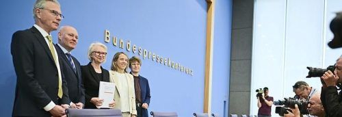 Die „Weisen“ und ihr unerfreuliches Gutachten: Martin Werding, Achim Truger, Monika Schnitzer, Ulrike Malmendier und Veronika Grimm treten am Mittwoch vor die Bundespressekonferenz. © Sebastian Gollnow/dpa