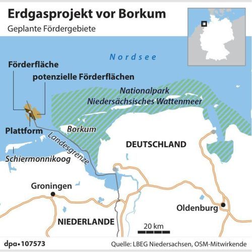 Berlin – Die umstrittenen Pläne zur Gasförderung vor der Nordseeinsel Borkum haben eine wichtige Hürde genommen. Das Kabinett stimmte in Berlin einem Gasförder-Abkommen mit den Niederlanden zu. Das völkerrechtliche Abkommen ist nötig, weil es um die Erschließung grenzüberschreitender Gasfelder geht.