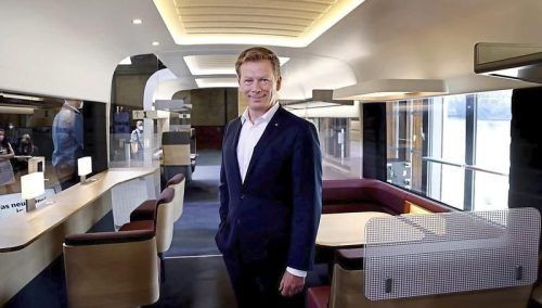 So schön könnte das Bahnfahren sein: Vorstandschef Richard Lutz präsentiert das neue Design für ICE-Züge. Doch die schlechten Nachrichten bei der Bahn überwiegen. © Carsten Koall/dpa