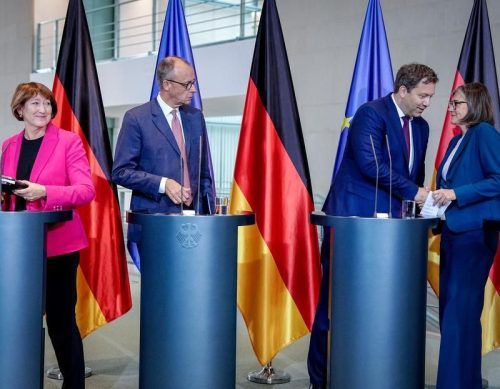 Händeschütteln nach dem Gipfel: VDA-Chefin Hildegard Müller, Kanzler Friedrich Merz, Finanzminister Lars Klingbeil und die Vorsitzende der Industriegewerkschaft IG Metall, Christiane Benner. © Kay Nietfeld