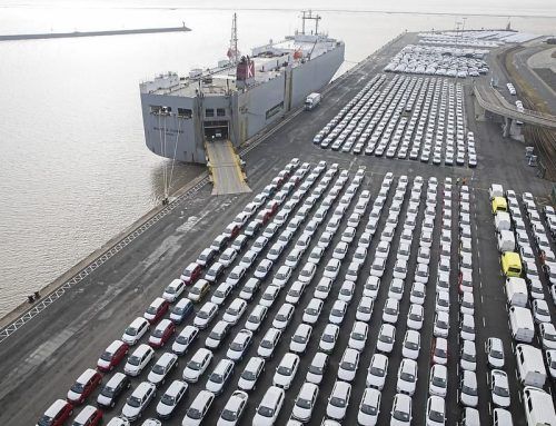 Starke Einbußen mussten die deutschen Autobauer hinnehmen. Hier stehen hunderte Fahrzeuge des Volkswagen-Konzerns im Hafen von Emden zur Verschiffung bereit. © Sarbach/dpa