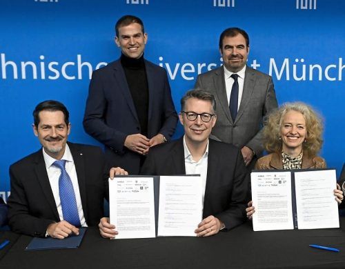 Bündeln Kräfte: TUM-Präsident Thomas Hofmann, Landtagsabgeordneter Maximilian Böltl, Bayerns Wissenschaftsminister Markus Blume, Florian Hahn, Staatsminister im Auswärtigen Amt und Eva-Maria Kern, Präsidentin der Bundeswehrhochschule Neubiberg (von links).