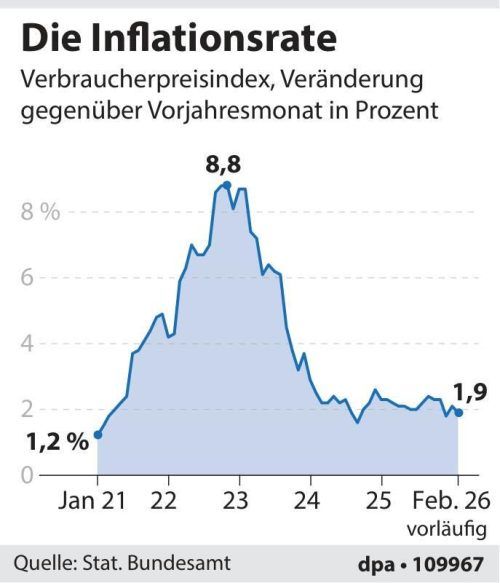 Wiesbaden – Kaum noch Preisanstiege bei Lebensmitteln und günstigere Energie: Die Inflationsrate in Deutschland ist im Februar wieder unter die Zwei-Prozent-Marke gefallen. Die Verbraucherpreise lagen um 1,9 Prozent über dem Niveau des Vorjahresmonats – nach 2,1