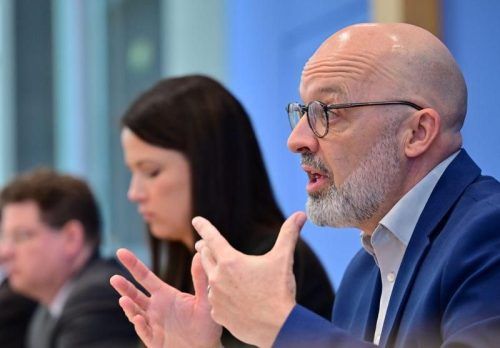 Frühjahrsgutachten im Zeichen der Energiekrise: Timo Wollmershäuser (vorne), Leiter der Konjunkturforschung am ifo Institut, spricht für die Institute. © Sebastian Gollnow/dpa
