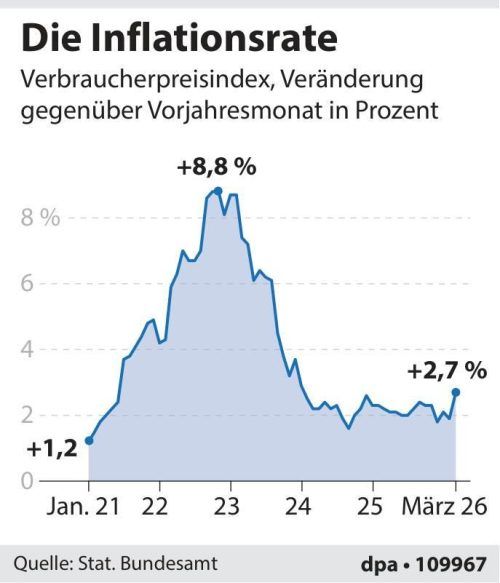 Wiesbaden – Benzin, Diesel und Heizöl haben die Inflationsrate im März auf den höchsten Stand seit rund zwei Jahren getrieben: Sie lag bei 2,7 Prozent im Vergleich zum Vorjahresmonat, wie das Statistische Bundesamt mitteilte und damit seine erste Schätzung bestätigte. Im Februar hatte sich die Teuer