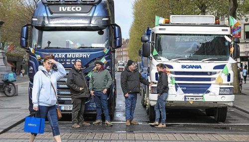 Lkw-Fahrer und Spediteure blockieren seit Tagen immer wieder wichtige Durchfahrtsstraßen, wie hier die O´Connell Street in Dublin. © Paul Faith/AFP
